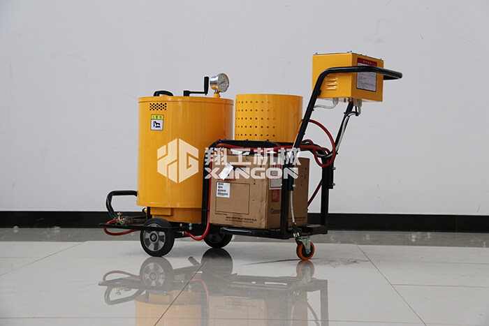 翔工60L手扶瀝青灌縫機采用液化氣加熱系統(tǒng),導熱油循環(huán),使瀝青或灌縫膠快速融化,通過瀝青泵的壓力由出料口出料而達到裂縫處理的效果。通過壓力注射式灌縫,使材料和縫壁緊密結(jié)合,轉(zhuǎn)向靈活的萬向輪追蹤裂縫,使灌縫效果美觀。由于灌縫材料使用瀝青或灌縫膠,在溫度較低時容易凝固,灌縫機配有發(fā)電機組提供整機動力,灌縫機在出料管部位采用恒溫控制系統(tǒng),避免材料燒焦老化,保證出料的順暢。