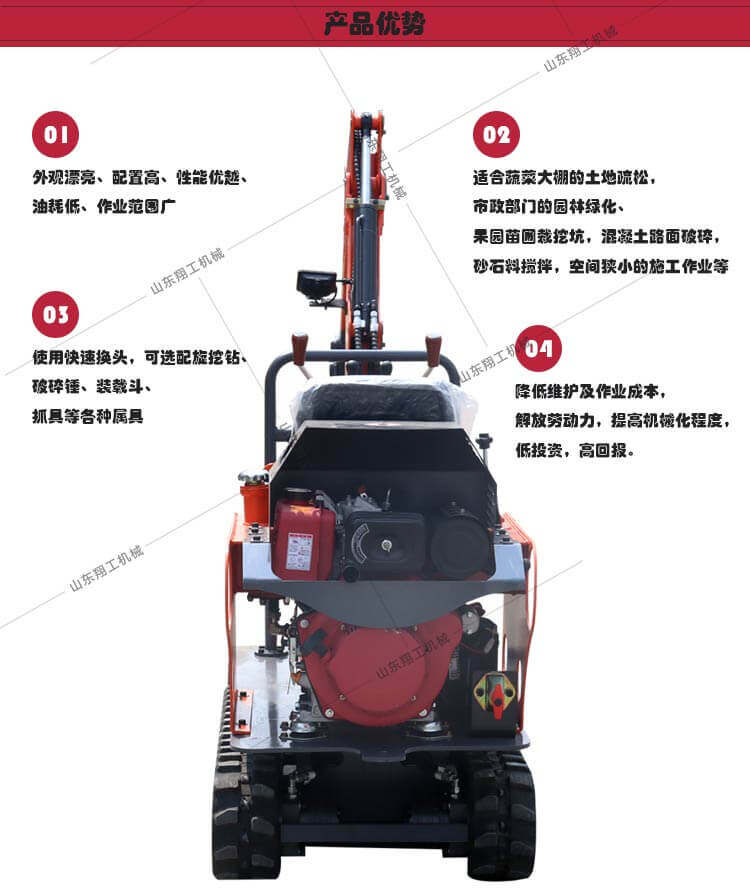 該產(chǎn)品外觀漂亮、配置高、性能優(yōu)越、油耗低、作業(yè)范圍廣,適合蔬菜大棚的土地疏松,市政部門的園林綠化、果園苗圃栽挖坑,混凝土路面破碎,砂石料攪拌,空間狹小的施工作業(yè)等,使用快速換頭,可選配旋挖鉆、破碎錘、裝載斗、抓具等各種屬具,降低維護及作業(yè)成本,解放勞動力,提高機械化程度,低投資,高回報。