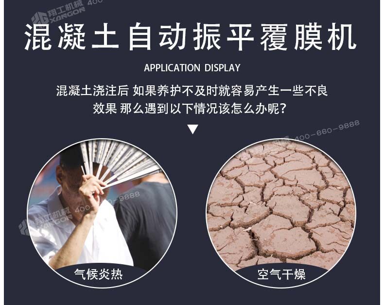 混凝土澆注后,如果養護不及時就容易產生一些不良效果,如氣候炎熱、空氣干燥等情況,我們就有必要使用這款設備,防止混凝土中的水分蒸發過快,形成混凝土表面脫水現象,使已形成凝膠體的水泥顆粒不完全水合,不能轉化成穩定的晶體,缺乏足夠的粘結力。因此,混凝土表面會出現剝落或粉粒脫落。另外,當混凝土強度不夠時,過早蒸發水分會產生較大的收縮變形和干縮裂縫。因此,混凝土澆筑后的初期養護非常重要,終凝后應立即進行養護。