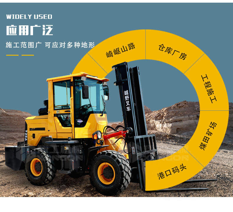 越野叉車適用于道路修筑、城市建設、環境衛生、石料場、中小型土木工程、車站、碼頭、貨場、倉庫等地方,主要用來轉運石料、設備、貨物、城市垃圾箱以及集裝物料等。