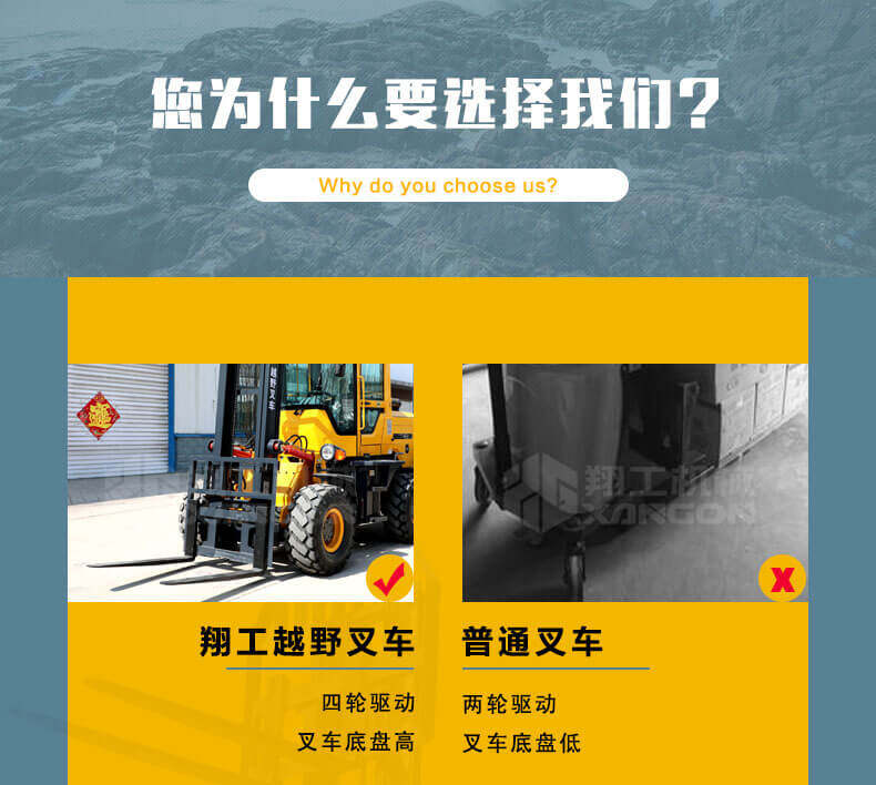 3.普通叉車只能在平整的路面上作業,而越野叉車既可以在普通路面上作業,還可以在山路泥路崎嶇道路作業,輪胎抓地力強,不打滑。