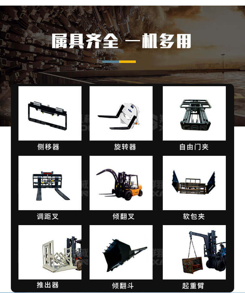 多功能越野叉車可以在坡地和不平地面上進行貨物裝、卸、堆垛及搬運作業,具有良好的機動性、越野性可靠性。其功能多樣,可搭配側移器、調距叉、旋轉器、軟包夾、推出器、側翻叉、側翻斗、起重臂等工具完成不同的工作。