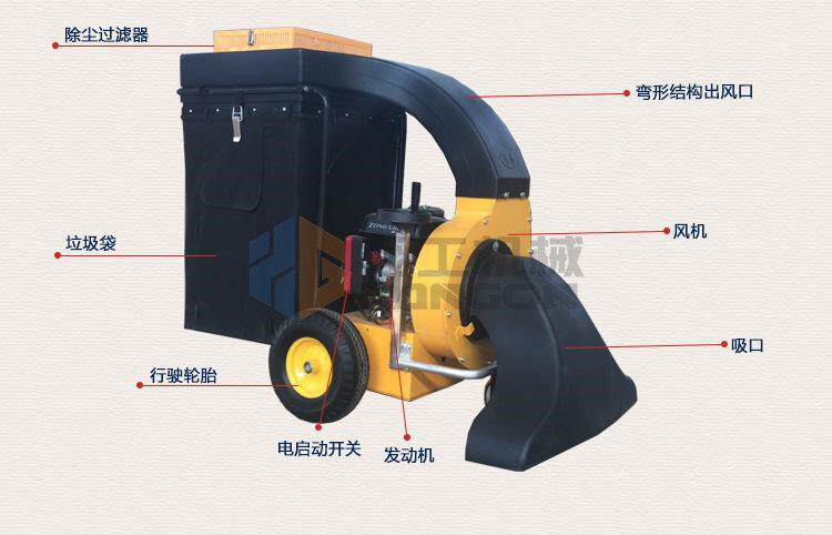 該設備工作效率高,比人工清掃效率高幾倍,可手推助力行走。垃圾儲存袋采用便捷式方式,便于更換垃圾,且使用成本較低。吸口可配置延長管,用來吸收綠化帶中的落葉和垃圾。吸口高度可調,面對落葉較厚或大的法桐樹葉較多的區域,也能輕松收集干凈。目前以用在環衛人行道、園林、物業小區、校園、公園、廣場、工廠廠區和車間等得到廣泛應用。
