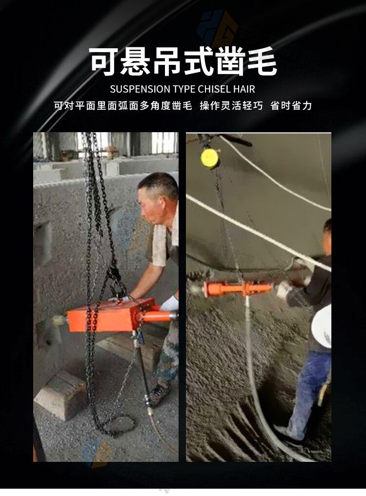手持式懸掛鑿毛機機身有吊環,鑿墻面的話吊起來使用,對平面、立面、弧形等多角度進行鑿毛作業,打擊力大、鑿深自如,應用領域非常廣泛,又省力還方便。 主要適用于水庫、大壩滲漏,險橋危橋、電廠、隧洞、高速公路、鐵路橋面以及箱梁混凝土等眾多領域 。主要是對混凝土表面進行剔鑿,建筑物墻體、地面以及市政工程混凝土面層剔除、修補、翻新、加固等。