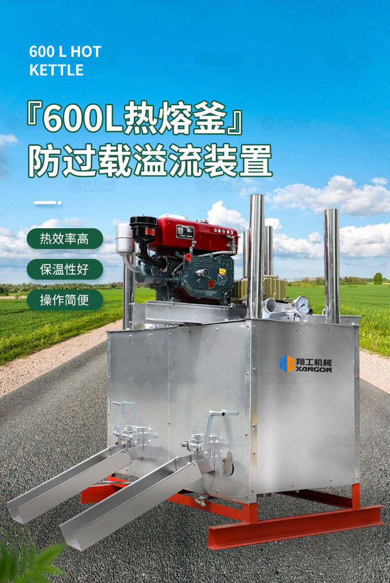 熱熔釜是一款熱熔標線施工的主要設備之一。標線施工時,先利用熱熔釜將粉末狀涂料加熱,攪拌,直到熱熔變成液態后,再將涂料放入劃線機內進行劃線施工。