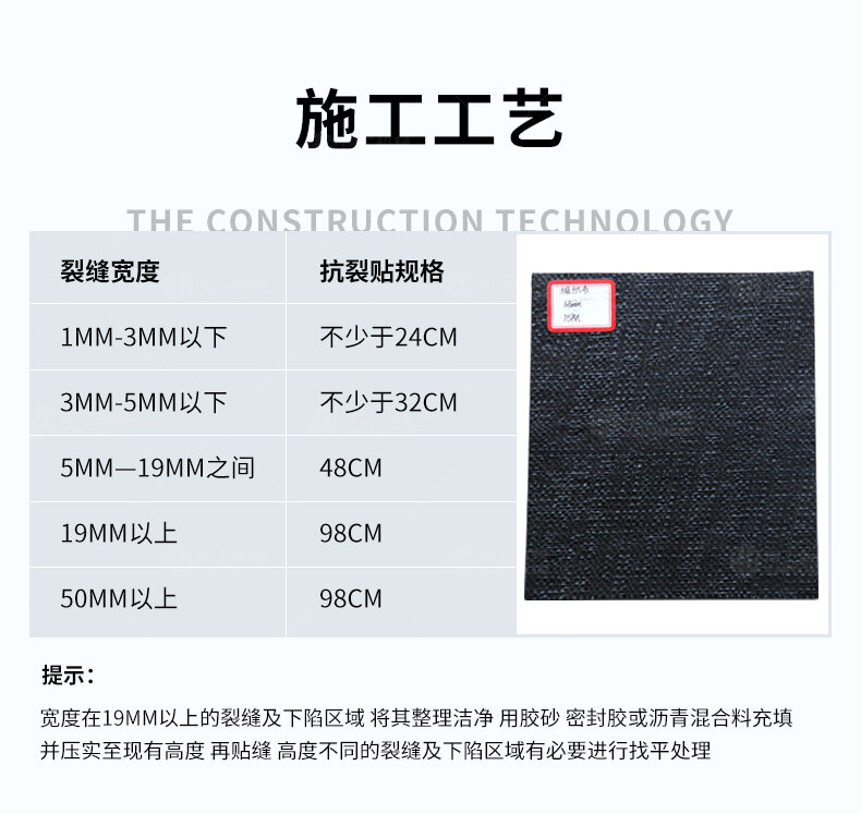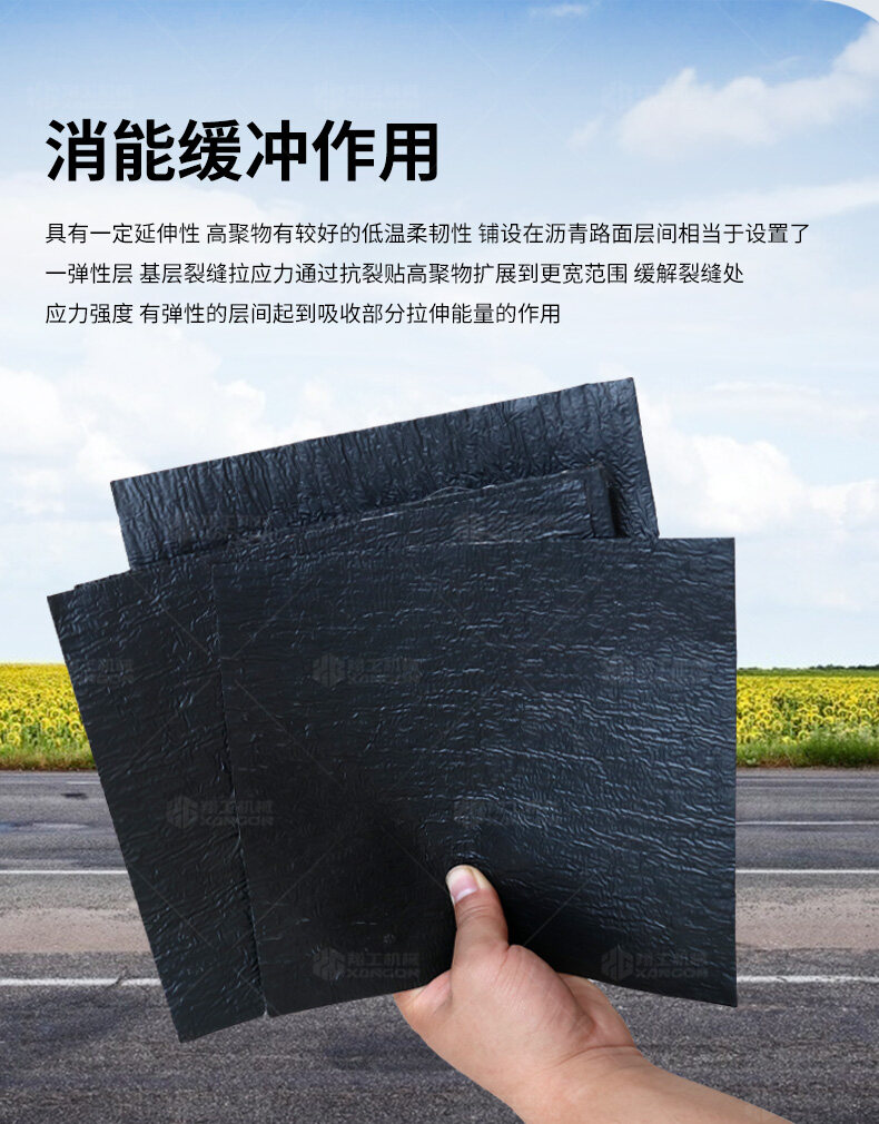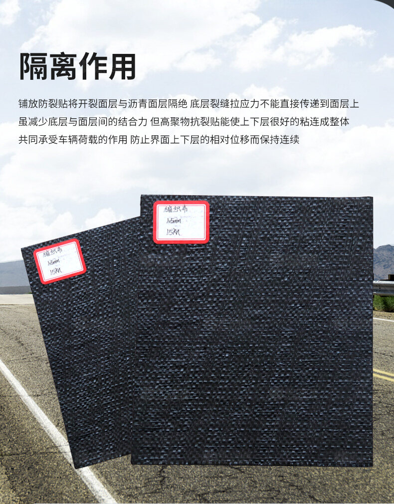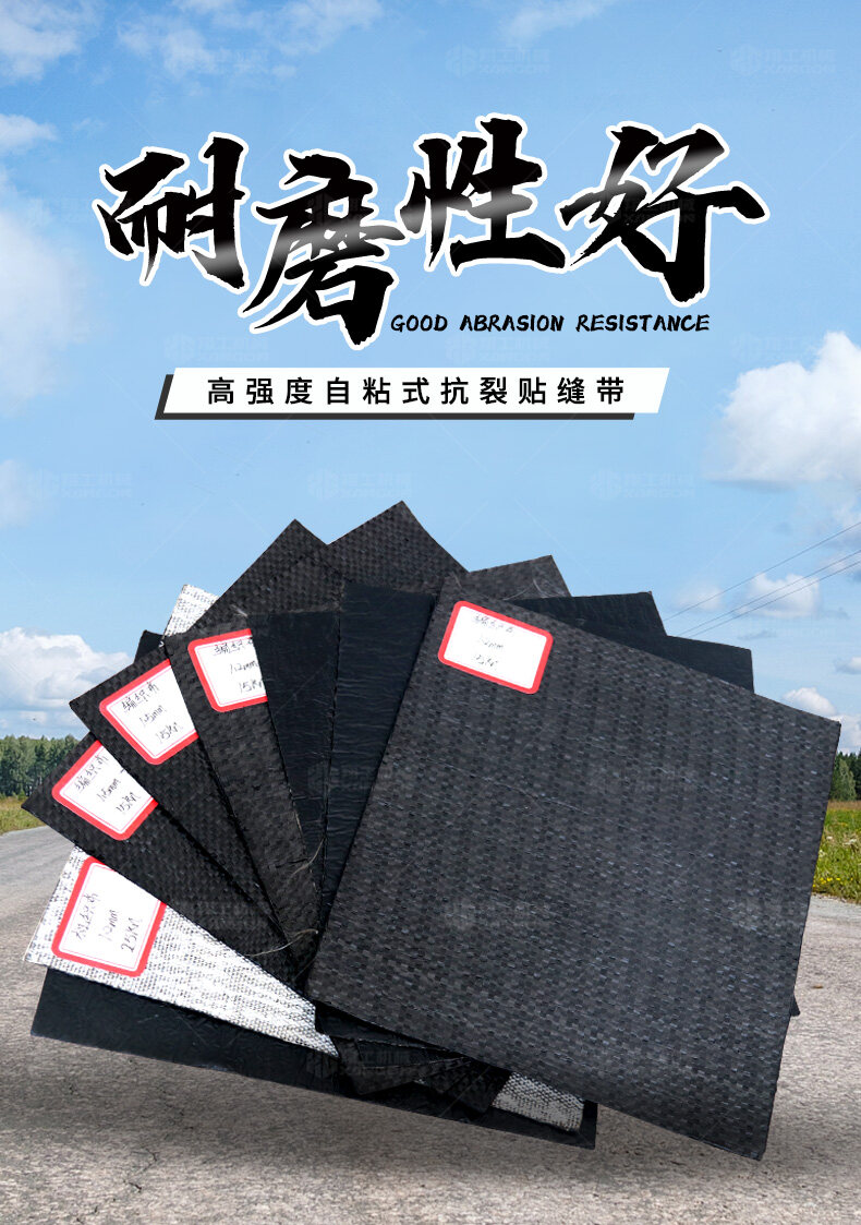 防裂貼(又稱抗裂貼)是由瀝青基的高分子聚合物、抗拉胎基、耐高溫并與瀝青相容的織物復合而成。將其貼于產生裂縫或剝落的瀝青混泥土面,能減少并阻隔其作用于路面的溫縮應力,因此也減少了裂縫反射穿過面層的趨勢,鋪設與路面因其將基層與上部磨耗層隔離開來,從而使上面層免受多向位移及剪切應力的影響,用于公路、橋梁、機場等。