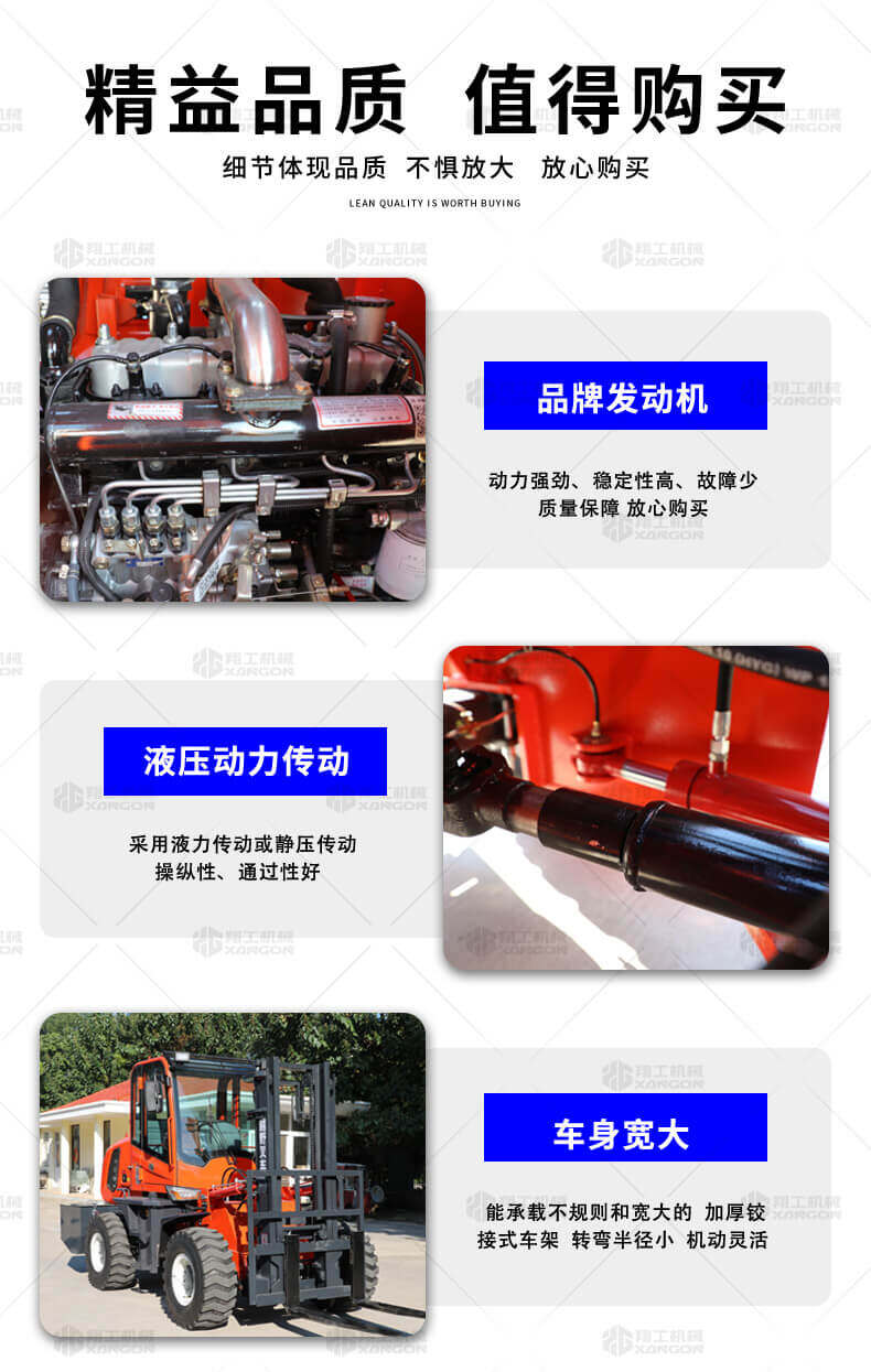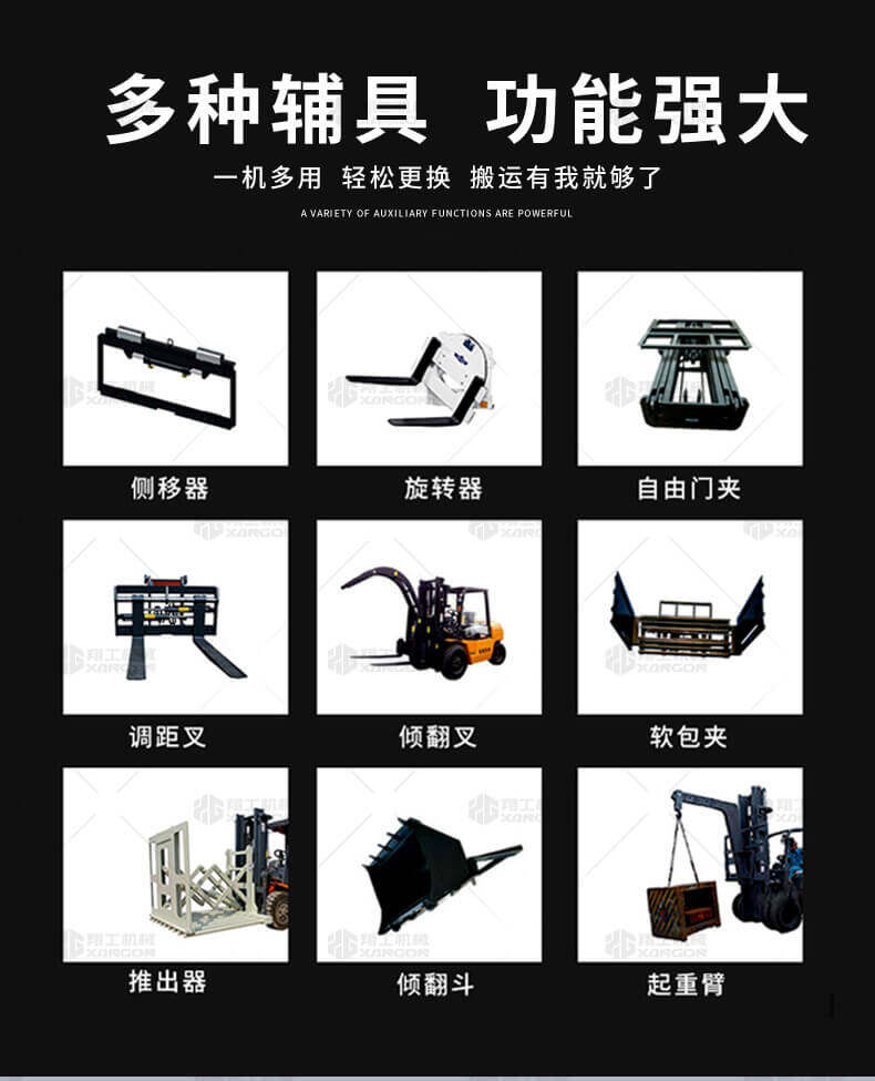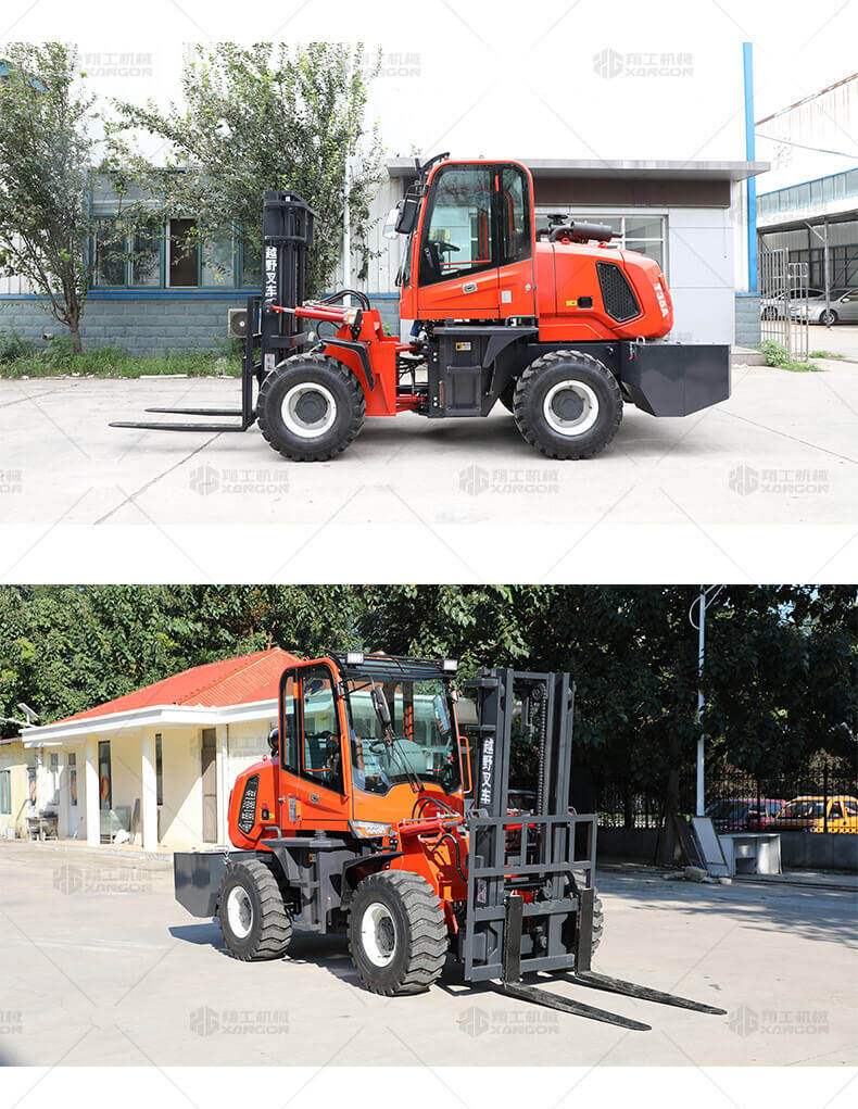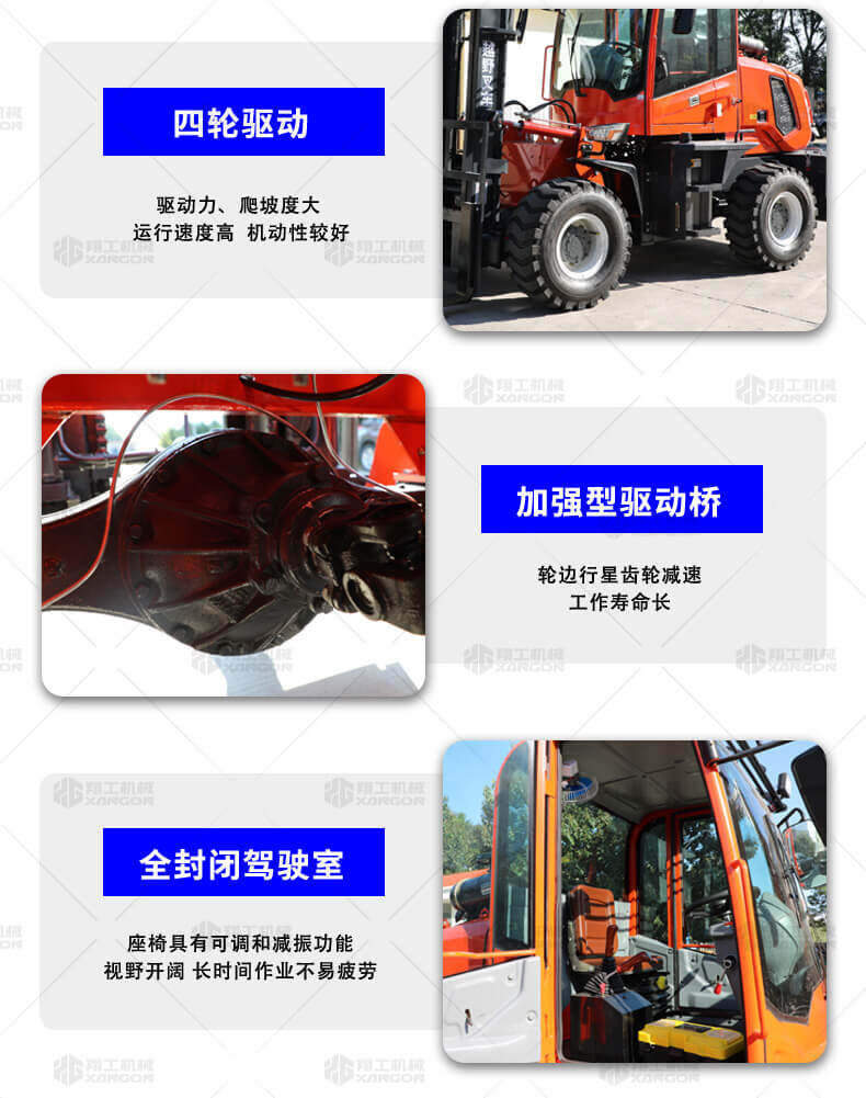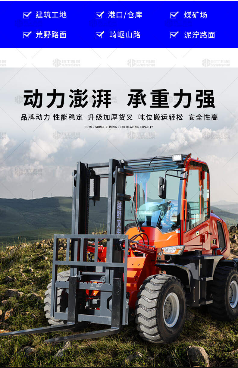 越野叉車可以在坡地和不平地面上進行貨物裝、卸、堆垛及搬運作業,具有良好的機動性、越野性可靠性。其功能多樣,可搭配側移器、調距叉、旋轉器、軟包夾、推出器、側翻叉、側翻斗、起重臂等工具完成不同的工作。