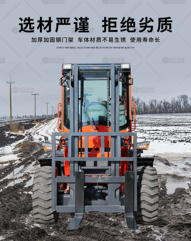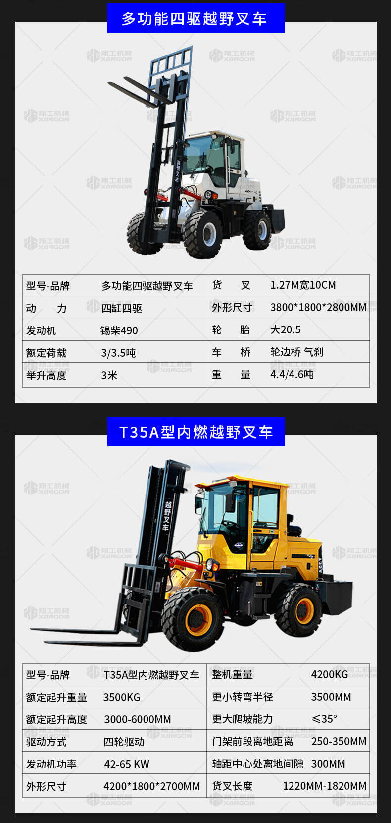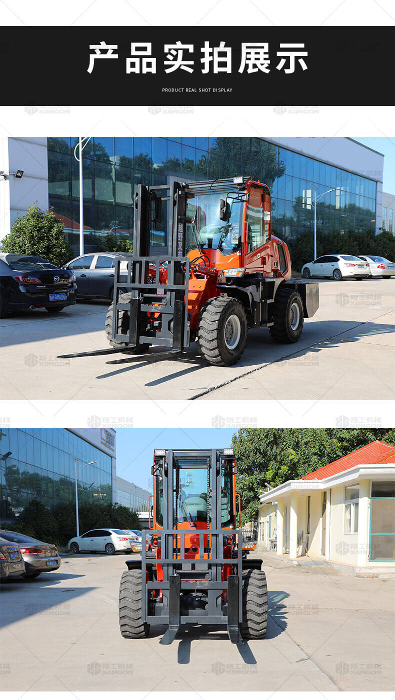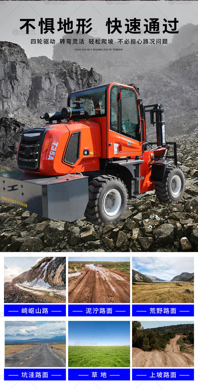 越野叉車可以在坡地和不平地面上進行貨物裝、卸、堆垛及搬運作業,具有良好的機動性、越野性可靠性。其功能多樣,可搭配側移器、調距叉、旋轉器、軟包夾、推出器、側翻叉、側翻斗、起重臂等工具完成不同的工作。