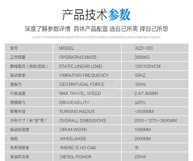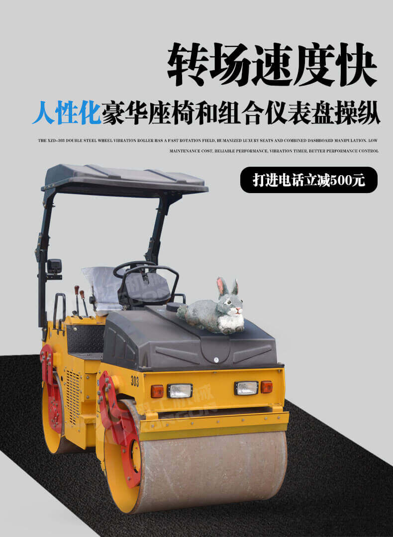 1,XZD-303雙鋼輪振動壓路機轉場速度快,人性化豪華座椅和組合儀表盤操縱。維修成本低,性能可靠,配置震動計時器,對工作績效更好地控制;