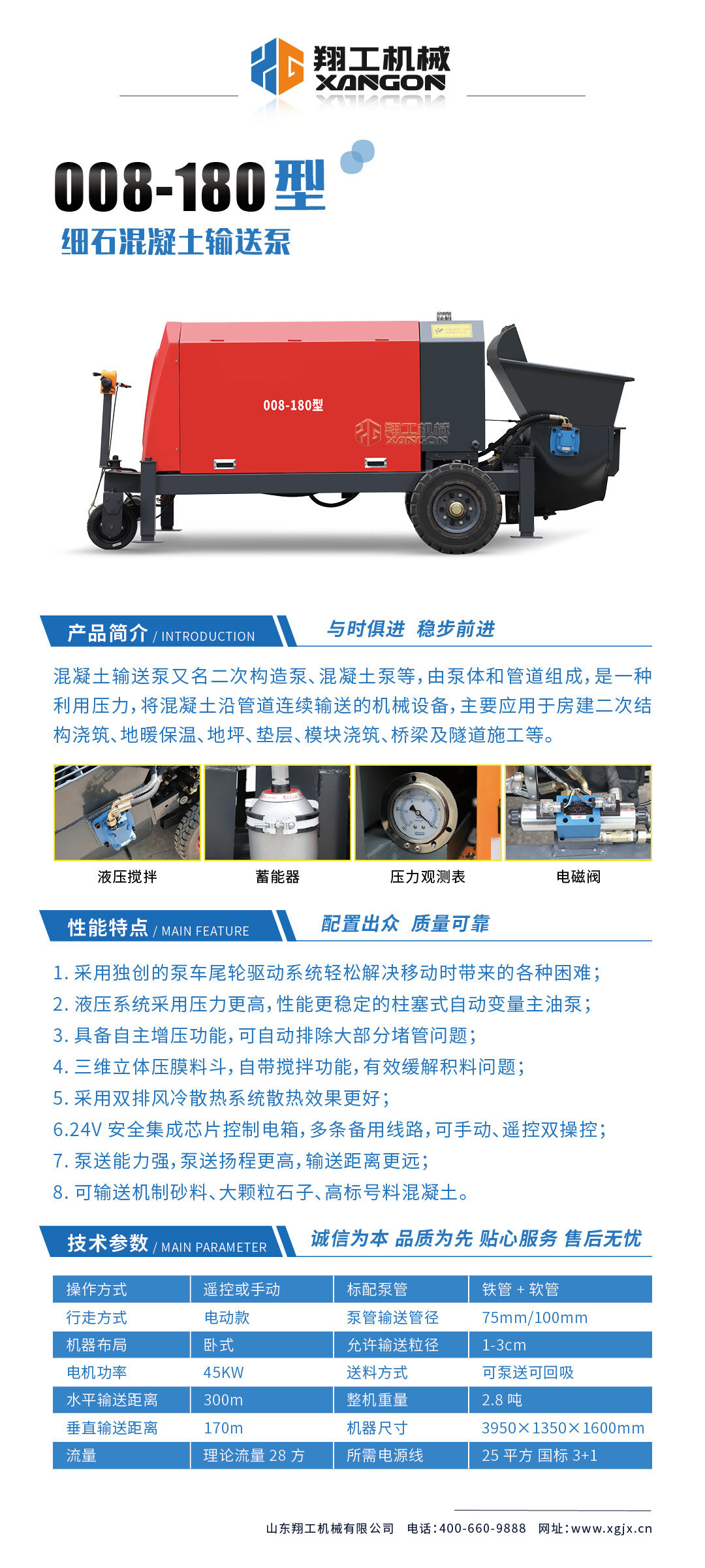 采用獨創(chuàng)的泵車尾輪驅(qū)動系統(tǒng)輕松解決移動時帶來的各種困難;采用雙排風(fēng)冷散熱系統(tǒng)散熱效果更好,液壓系統(tǒng)采用壓力更高,性能更穩(wěn)定的柱塞式自動變量主油泵,采用先進(jìn)的三維立體壓模一體式自動攪拌料斗可輸送機制砂,高標(biāo)號混凝土,有效緩解積料問題。