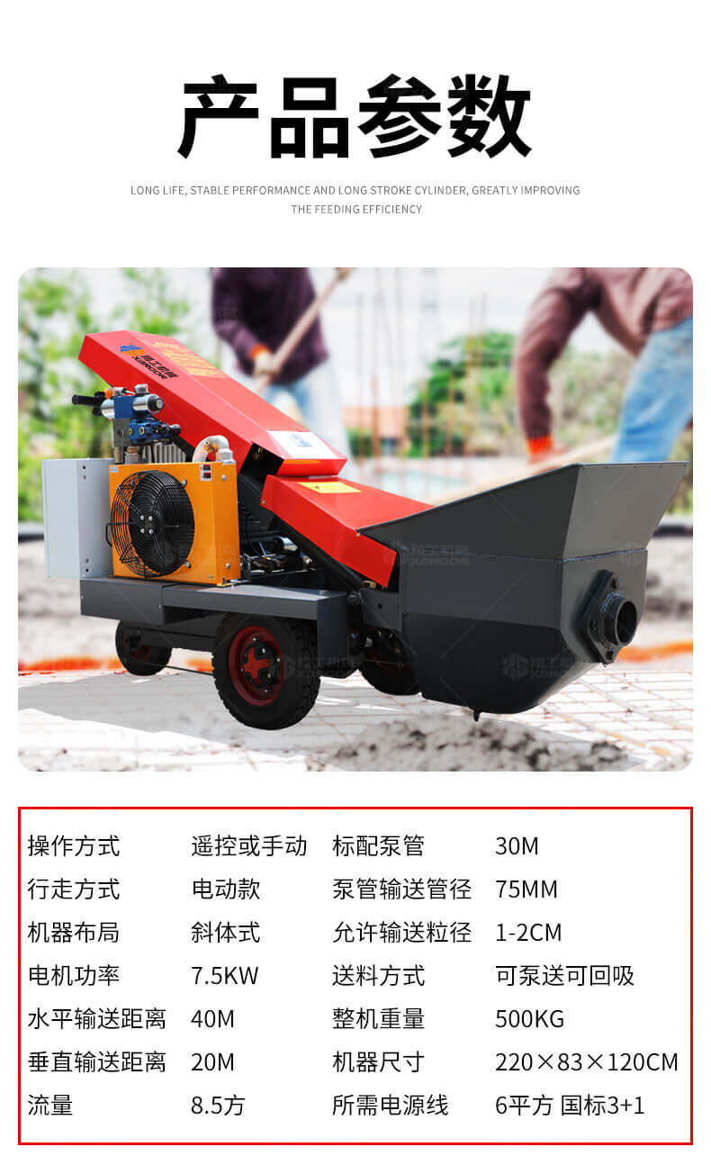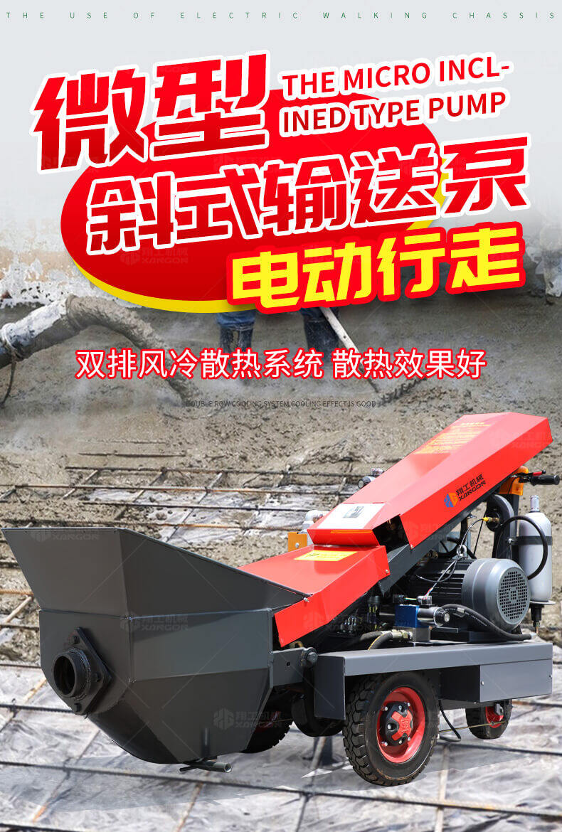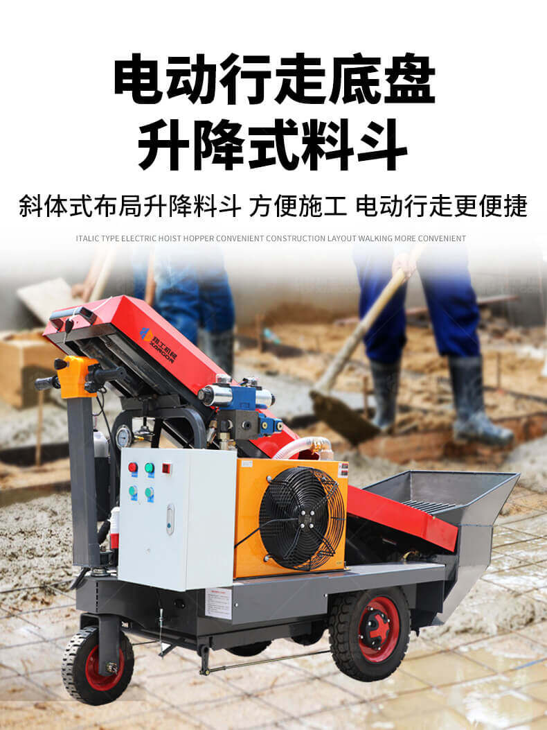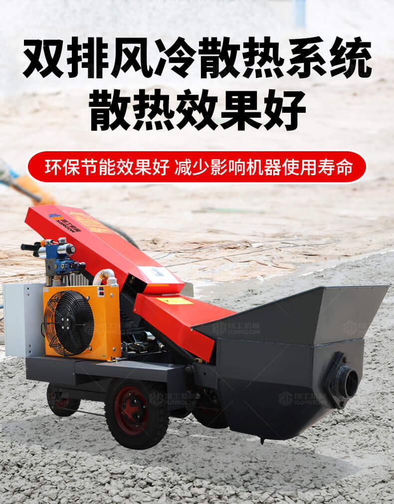 采用電動行走底盤,斜體式布局升降料斗,采用雙排風冷散熱系統散熱效果更好,液壓系統采用國內知名廠商葉片泵,故障率低,壽命更長,性能更穩定,超長行程料缸大大提高了輸送效率。