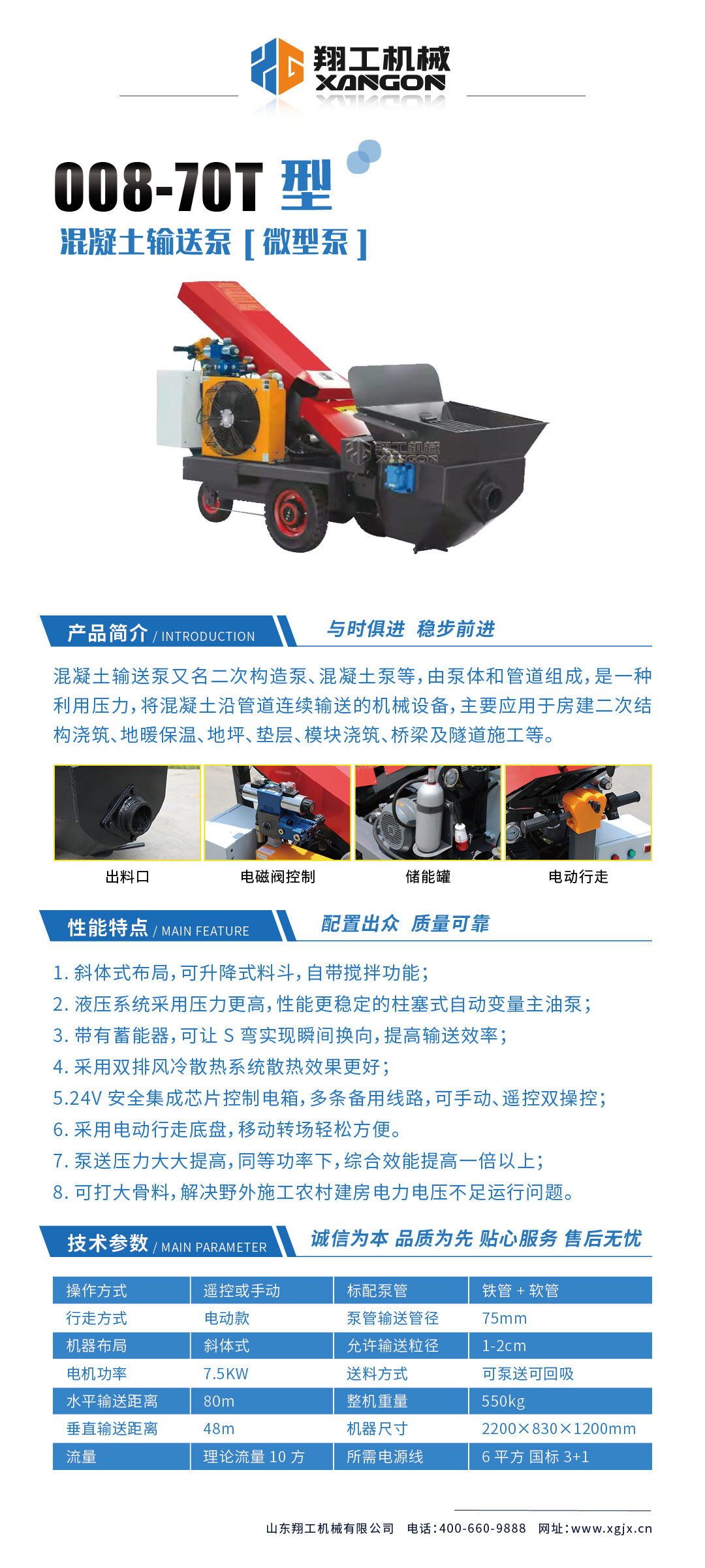 采用電動行走底盤,斜體式布局升降料斗,采用雙排風(fēng)冷散熱系統(tǒng)散熱效果更好,液壓系統(tǒng)采用壓力更高,性能更穩(wěn)定的柱塞式自動變量主油泵,料斗自帶攪拌功能防止骨料沉淀造成堵管,泵送壓力大大提高,同等功率下,綜合效能提高一倍以上。由于其功率較小,能打大骨料,解決了野外施工,尤其是農(nóng)村建房電力電壓不足,不能滿足大功率設(shè)備運行的問題。