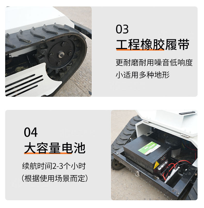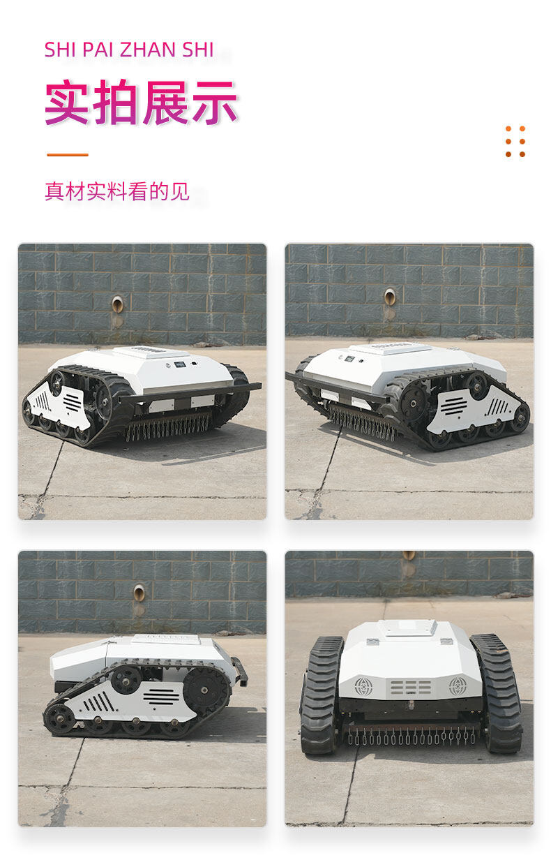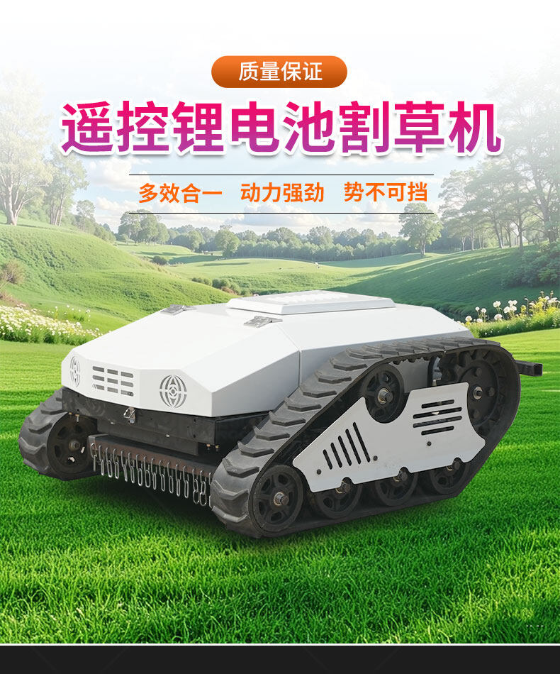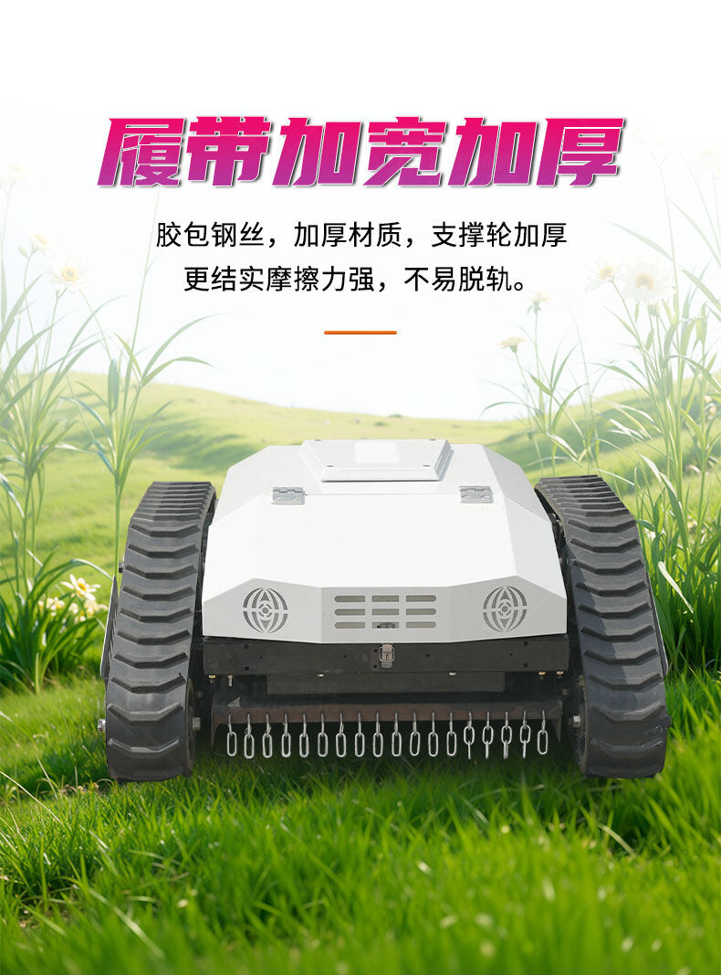 智能遙控履帶割草機采用鋰電池驅動,節能環保,續航持久;履帶式底盤設計,輕松應對復雜地形,爬坡越障能力強。配備智能遙控系統,操作簡單便捷,可遠距離精準控制。高效割草,低噪運行,適用于庭院、公園及專業草坪養護,是現代化園林管理的理想助手。