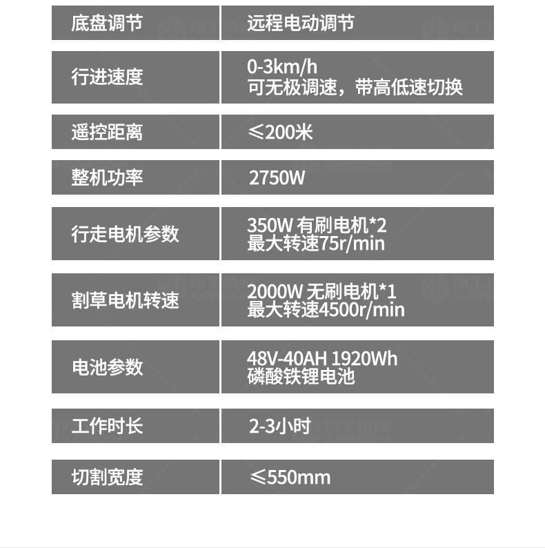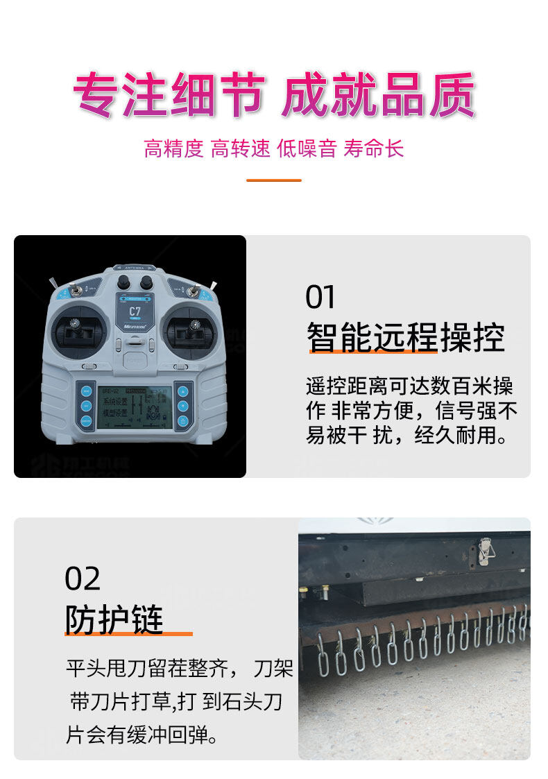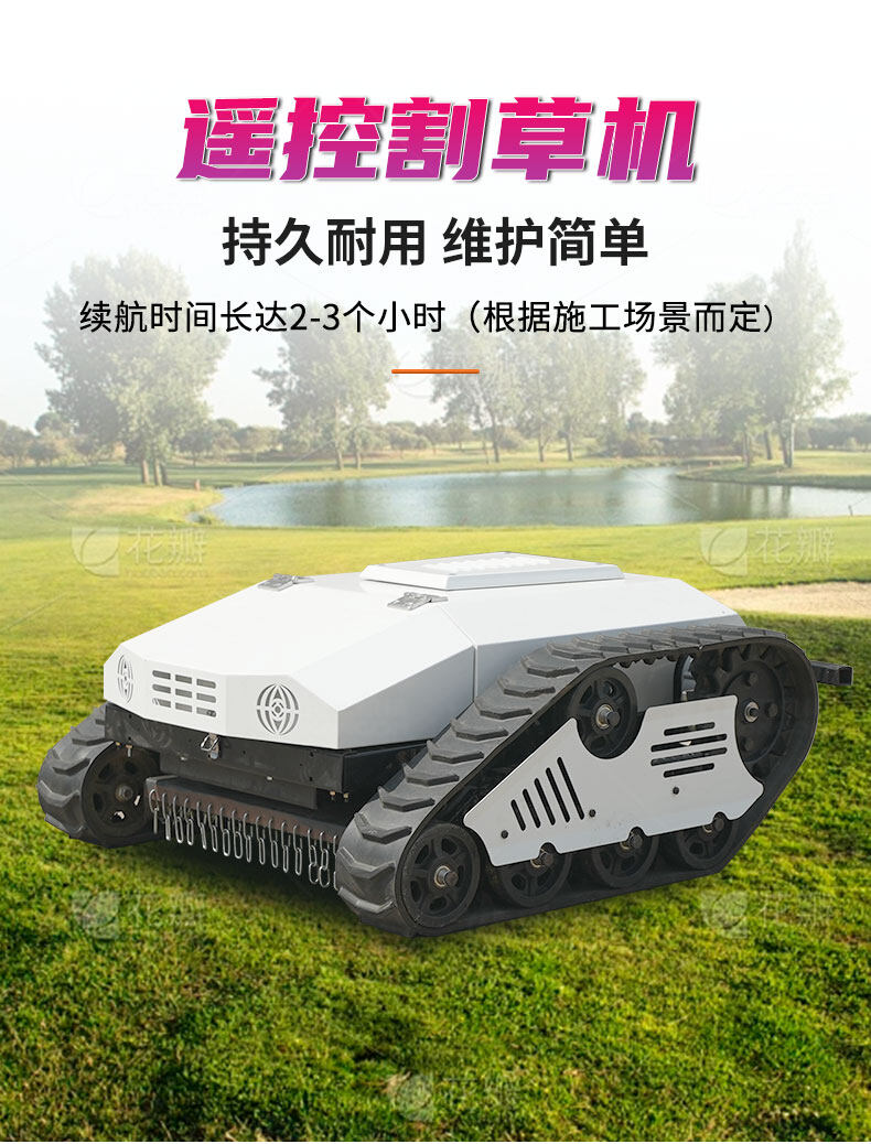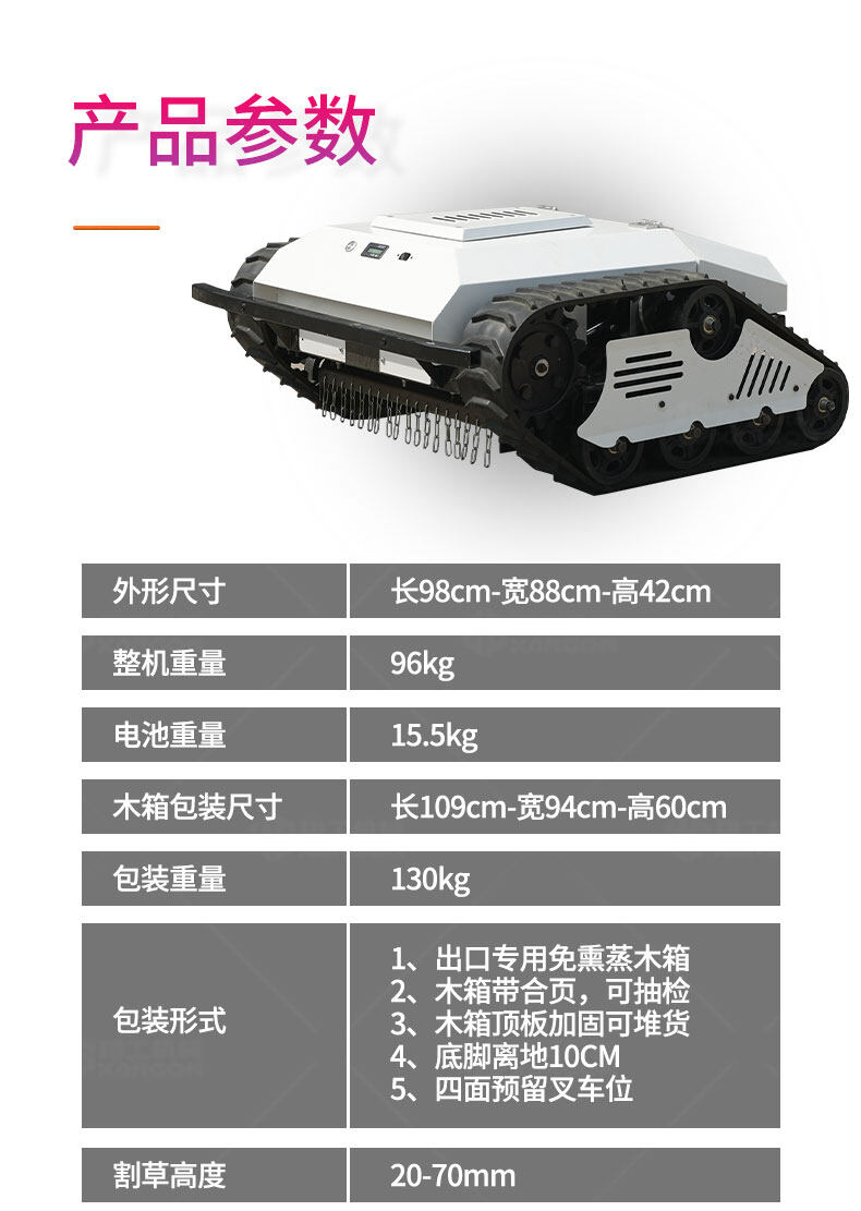 智能遙控履帶割草機采用鋰電池驅動,節能環保,續航持久;履帶式底盤設計,輕松應對復雜地形,爬坡越障能力強。配備智能遙控系統,操作簡單便捷,可遠距離精準控制。高效割草,低噪運行,適用于庭院、公園及專業草坪養護,是現代化園林管理的理想助手。